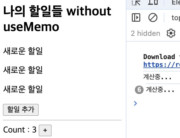 - counter ํธ์ถํ ๋๋ expensiveCalculation(count); ๊ฐ ๋ถ๋ฌ์ ธ์ผํ๋ ๊ฒ ๋ง์ง๋ง,